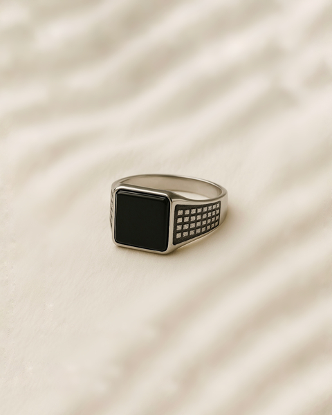 O Anel Masculino Aço Inox com Resina Preta e Gravações é a escolha perfeita para homens que buscam um acessório moderno e sofisticado. Seu design imponente traz gravações laterais marcantes e uma superfície quadrada achatada preenchida com resina preta, conferindo um toque de elegância e exclusividade.